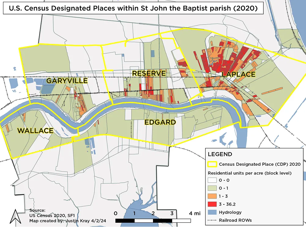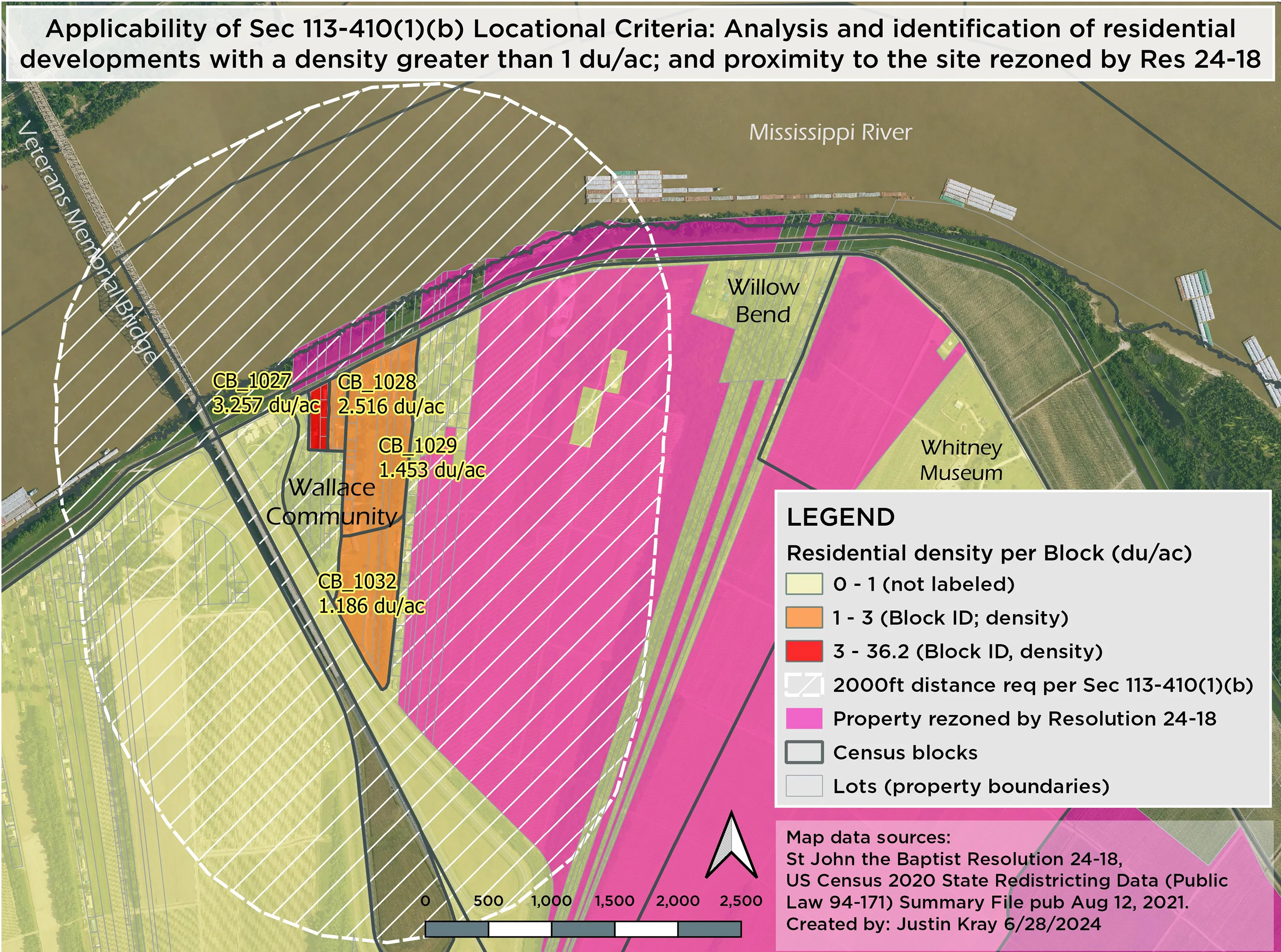 I was hired to develop an alternative analysis, that would evaluate residential density within the parish using a logically sound and defensible methodology, which demonstrates sufficient density in the community, and drew the distance requirement using GIS, to show how badly the industrial rezoning failed to meet the required setback distance from residential areas. I also prepared a written report that was filed along with a lawsuit brought by Descendants Project by Most & Associates to challenge the legality of the local rezoning ordinance. I was also able to demonstrate that a faulty outcome of the parish’s own methodology would allow industrial proliferation throughout the entire parish, and ignore the distance requirement text.